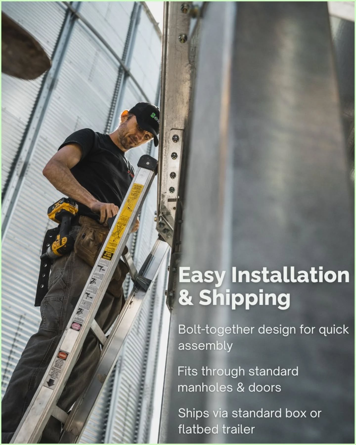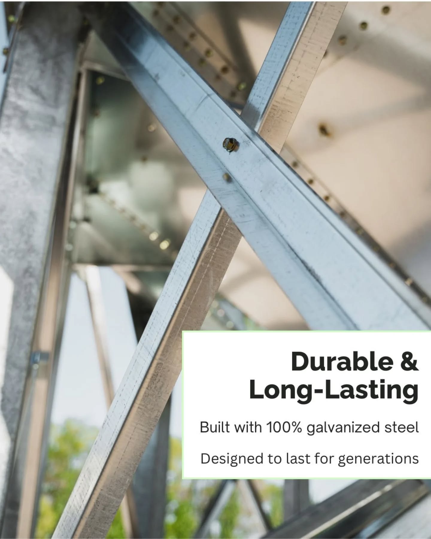 • Bolt‑together galvanized steel construction for durability and easy shipping.